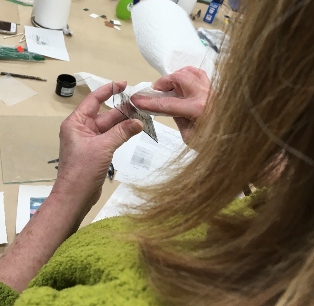 I have gel plates, brayers, paper and paints. If you have special papers or paints, or your own gel plate and brayer, please bring if you’d like.
